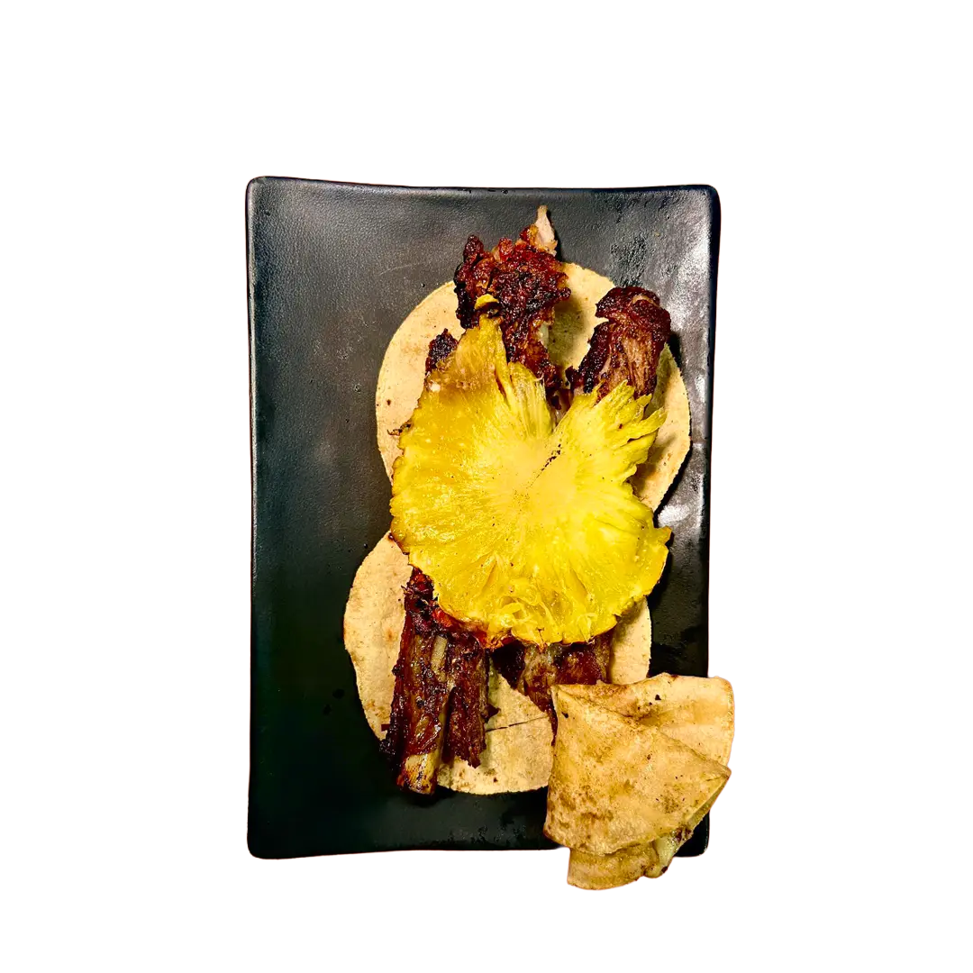 Una explosión de sabor salvaje en cada bocado. Disfruta de nuestra carne de jabalí seleccionada, marinada en especias tradicionales y asada a la perfección para lograr esa textura suave y jugosa. Coronada con una rebanada de piña asada que aporta el toque dulce y ácido ideal para equilibrar la intensidad del monte.