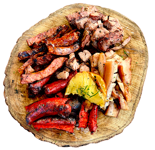 Porque los mejores momentos se disfrutan al centro de la mesa. Nuestra parrillada es un festín diseñado para compartir, reuniendo una selección de nuestros mejores cortes, embutidos y guarniciones asadas a la perfección. Una explosión de sabores diversos que garantiza que todos encuentren su bocado favorito.
